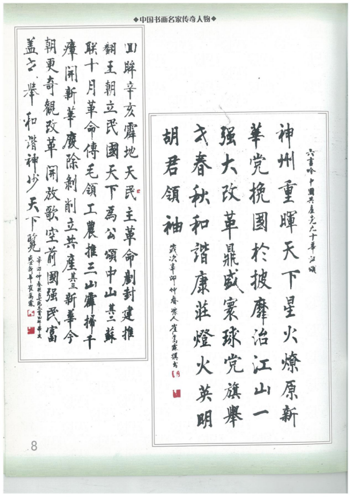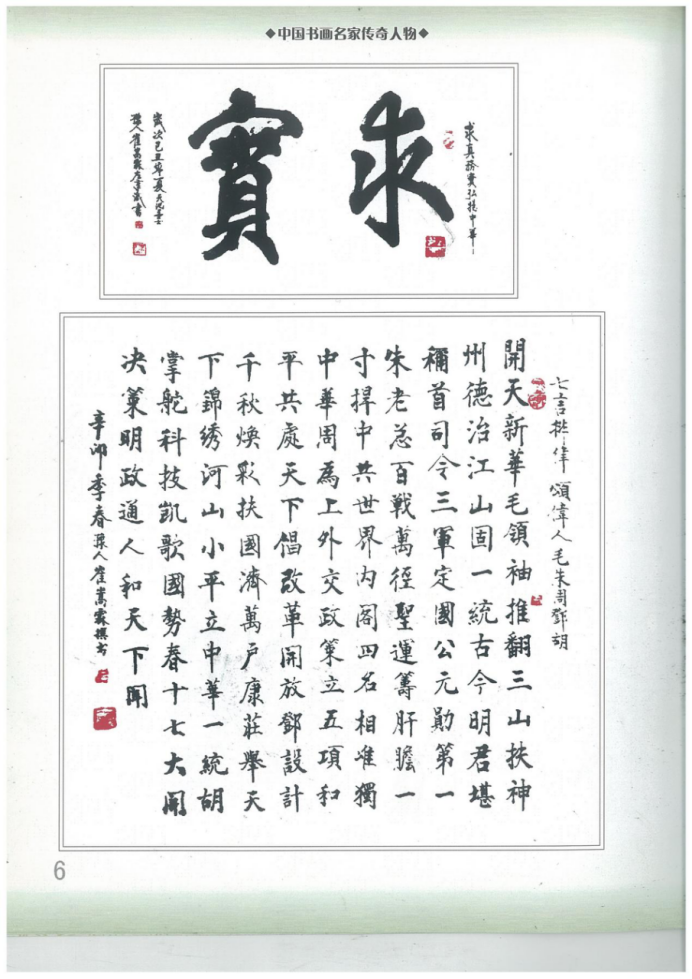 寅虎咏春全国诗书画印四绝大赛获寅虎艺术综合奖暨书法佳作一等奖,授予“中华百强书画家诗词家”称号。同年入中国书画名家上海世博国际交流展获特金奖角逐,荣获“中国世博书画名家”荣誉称号。”1985年参加阜康市春联大展,写联八副,获一等奖,诗作《墨海情》获一等奖。在情系2008迎奥运书画大赛中作品获金奖,左笔书法获二等奖。在第八届中欧文化艺术交流展中获突出贡献金奖证书、中欧文化艺术交流杰出艺术家金匾和中欧文艺交流特使称号证书。参加首届中日文化艺术交流展获金奖证书和匾牌,获“中日突出贡献艺术交流特使”荣誉称号。2008年作品入选《共和国经典诗词·格言选粹》一书。作品先后获全国特等奖多次,被授予“改革开放三十周年全国百名文化人物”称号。作品入编《中华爱国书画家精品宝典),被授予“人民功勋书画家”称号及勋章。同年作品入选《庆祝中华人民共和国成立六十周年当代诗词、格言名家精品大典》获全国三十名特等奖之一,被授予“文学之星”荣誉称号。同年又参加北京夕阳红老年书画院举办的庆澳门回归十周年书画展作品获奖入选《当代名家系列丛书》。2009年又参加纪念黄庭坚“幽兰赋”书赛,作品获金奖入编(精品集)一书。参加“中华杯诗、书、画、印大赛获佳作奖。入首届丹青绘华夏艺术大赛,获最高金奖奖项。同期参加画圣吴道子书画征稿赛走进感恩重建汶川大地震书画赛获银奖。