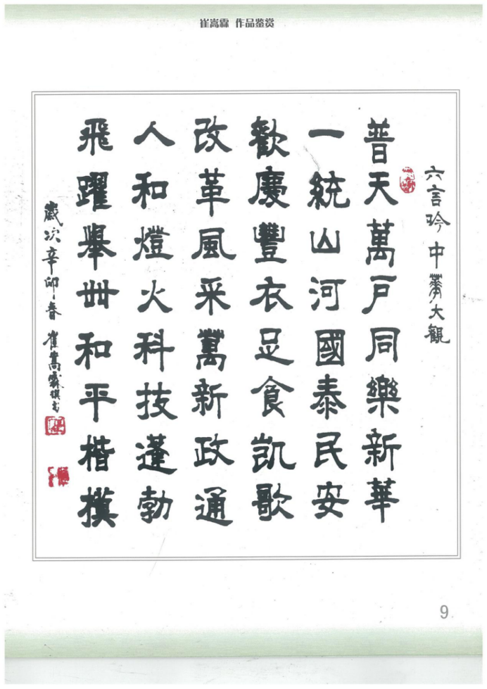 崔嵩霖,字文山,号景长,笔名中峰,大专学历,1939年生,河南长葛人。1996年退休。自幼酷爱书法,擅长诗生联,工作之余朝夕苦习无懈。擅长右手行、楷,左手篆、隶、斗书。自1985年来多次参加本市及外地诗书画赛展多次获奖。现为九州枫林国际书画艺术研究院院士、中国当代文学研究会顾问、黄庭坚书法艺术学会艺术顾问、画圣吴道子艺术研究馆一级书画师、北京炎黄艺术诗书画研究所顾问、新疆昌吉书法家协会会员、新疆阜康市书法家协会理事、阜康市老年书协成员。
